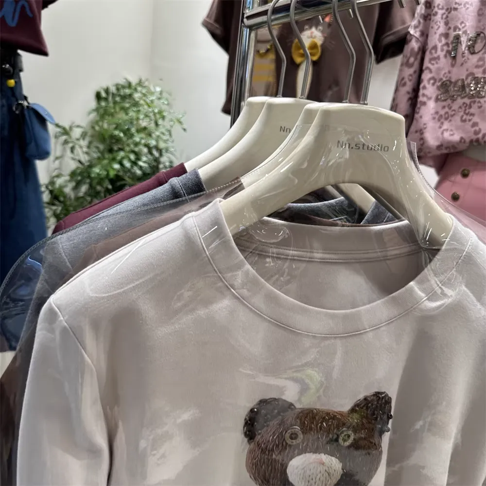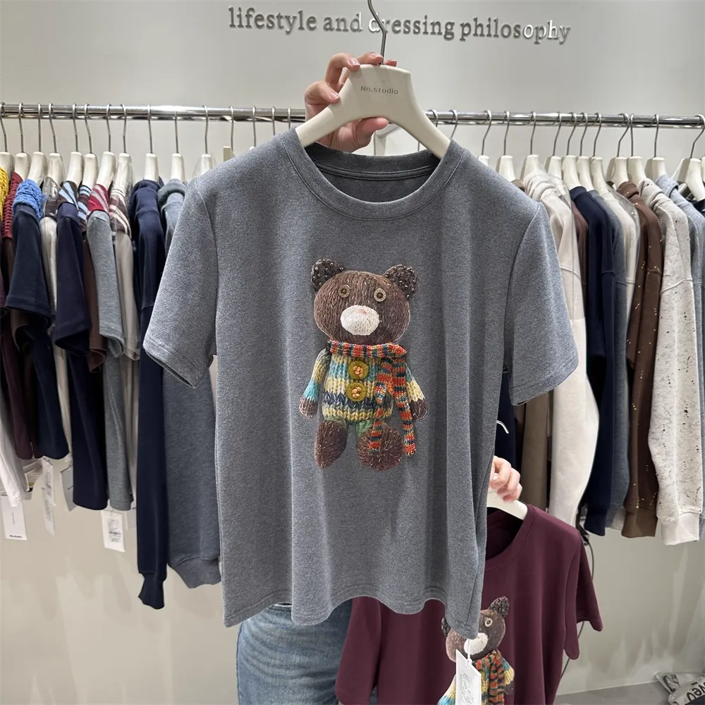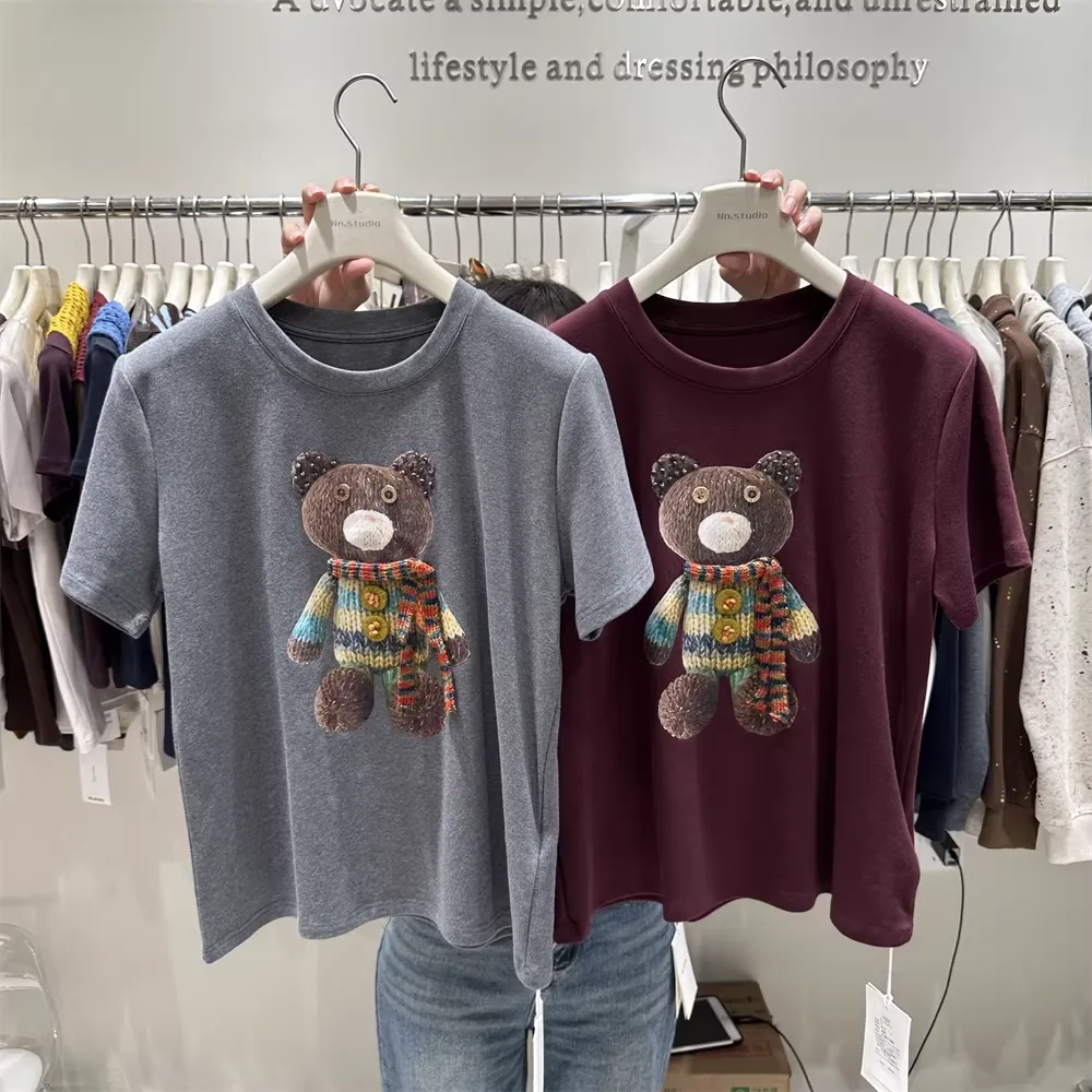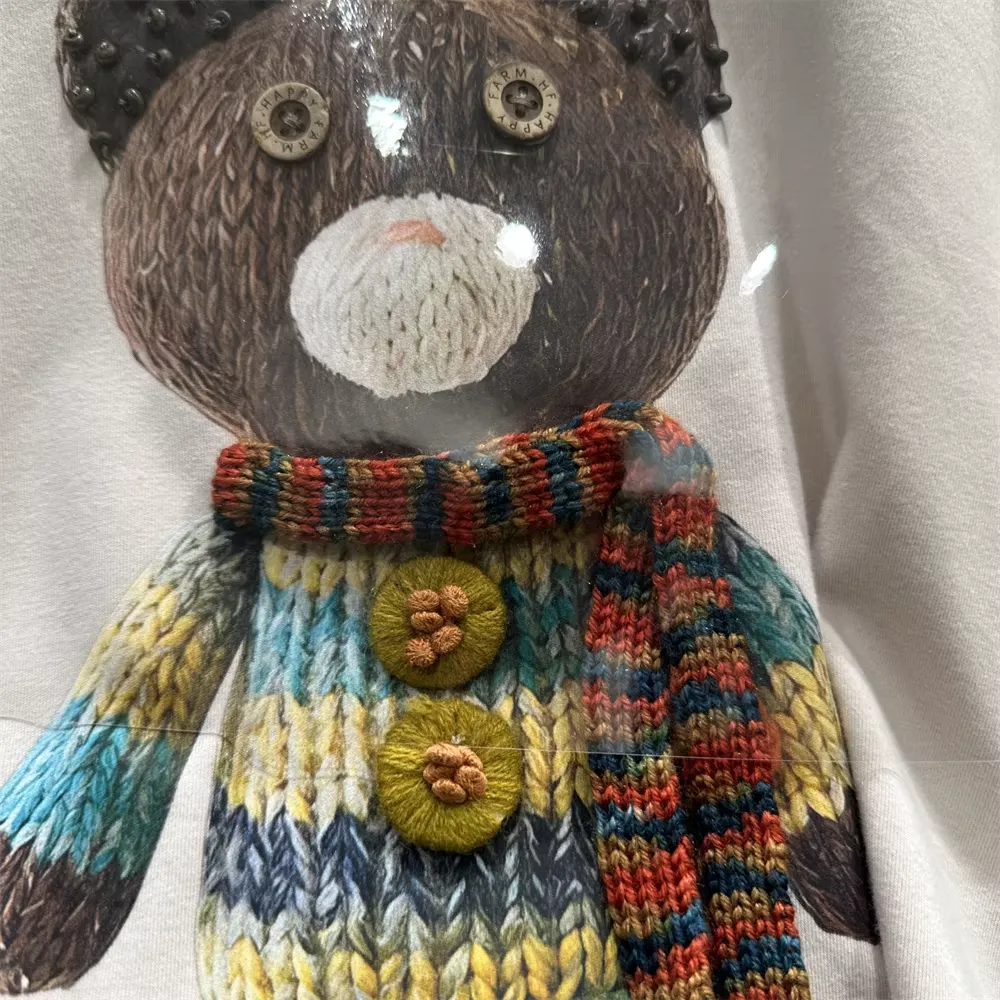 The bear on the tee features 3D details—round decorative buttons and delicate textured patterns, with a subtle tactile feel that wraps you in a warm, gentle aura both visually and to the touch~